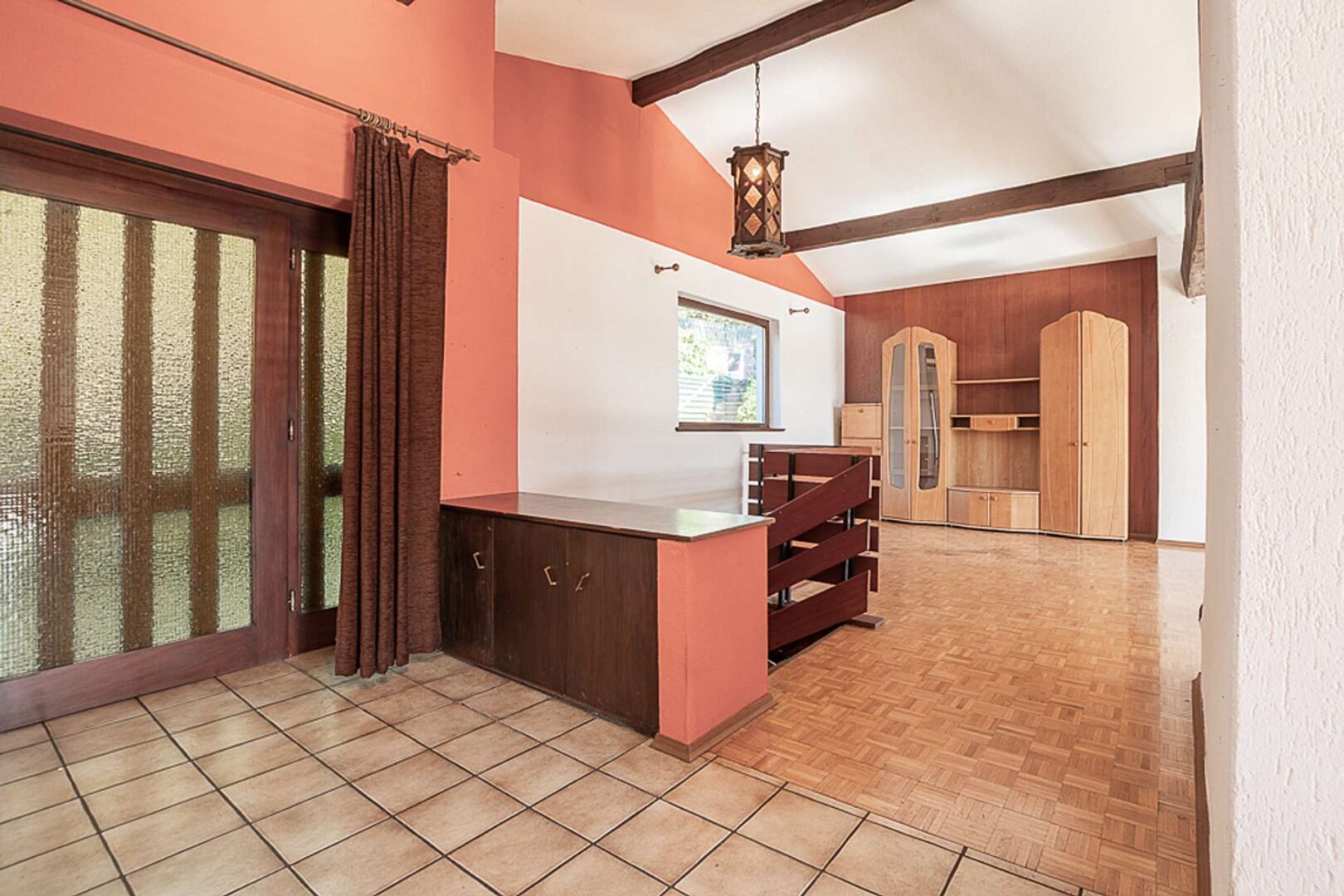 Über die zweite Tür des Wohnzimmers im Untergeschoss erreichen Sie die Diele mit der zweiten Hauseingangstür des Untergeschosses. Hier besteht die Möglichkeit die Einliegerwohnung mit dem Wohnzimmer, oder eben ohne Wohnzimmer (dann als 2-ZKB-Wohnung) zu vermieten. Auch im Wohnzimmer im Untergeschoss befindet sich ein gemütlicher Kaminofen.