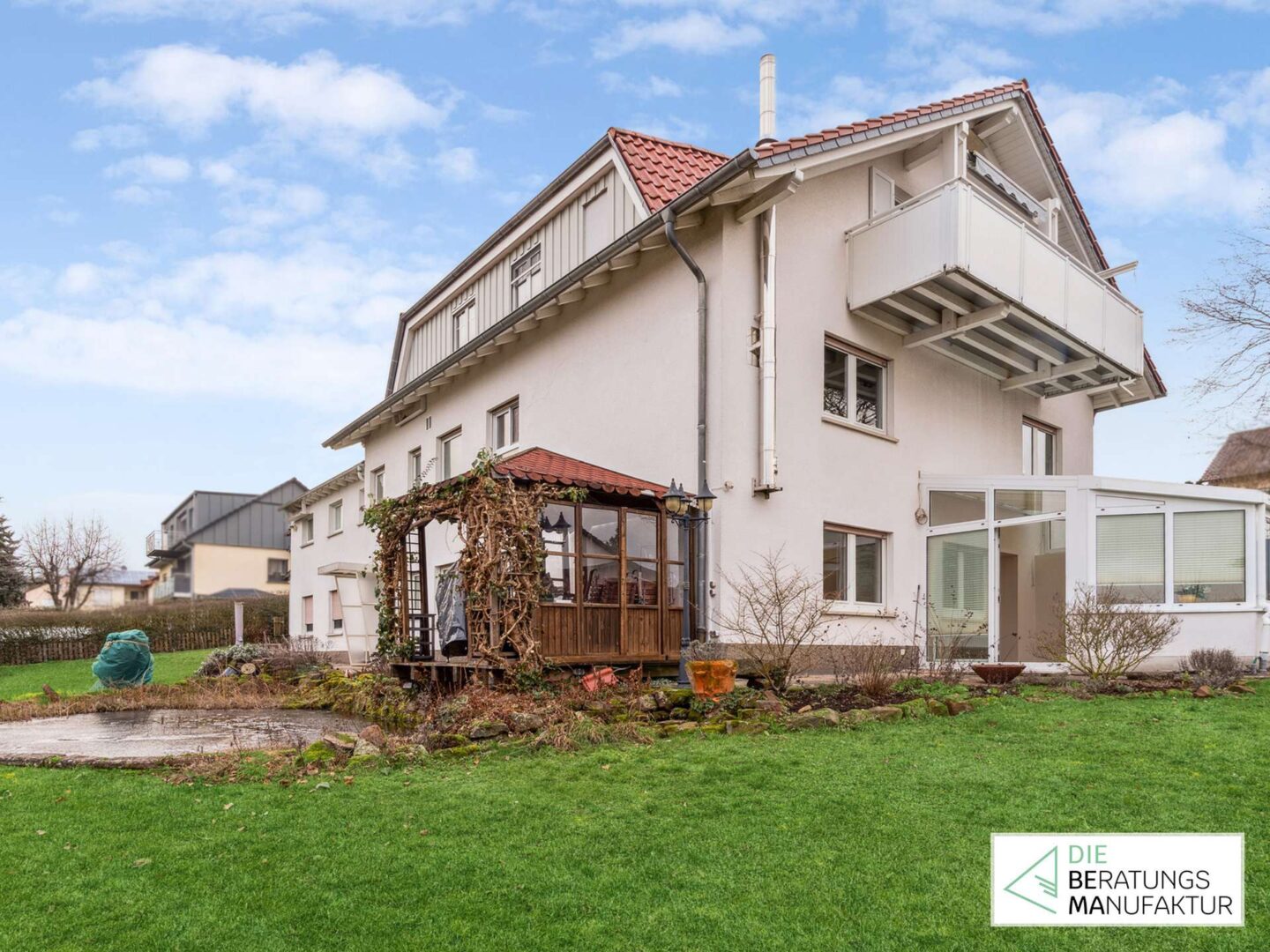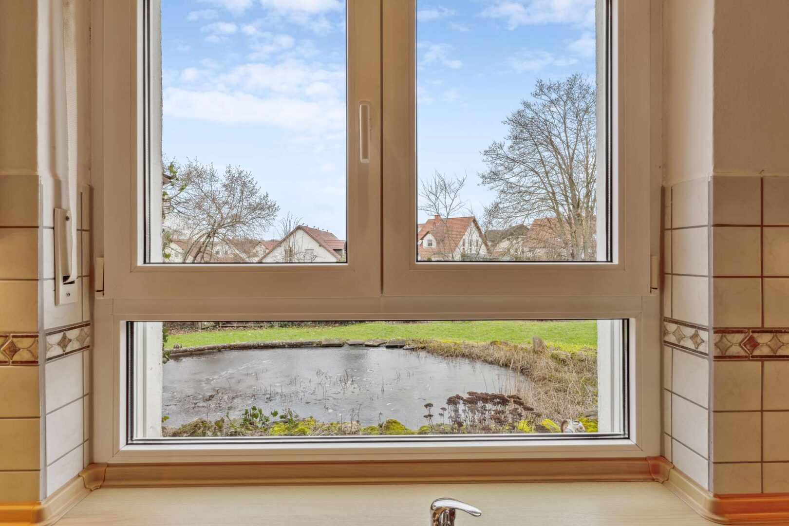 Hereinspaziert in Ihren hellen und freundlichen Wohntraum! Denn denn diese Wohnung besticht im Gegensatz zu anderen Wohnungen, die sich im unteren Geschoss befinden, durch ein Maximum an Licht. Dazu trägt unter anderem Ihr gläserner Wintergarten bei, der auch an trüben Tagen für ein angenehmes Wohngefühl sorgt. Zusammen mit Ihrem Wohn- und Essbereich, in dem nach Abstimmung mit dem Schornsteinfeger ein Kaminofen installiert kann, bildet er das Herzstück Ihres Zuhauses. Im Raum nebenan befindet sich Ihr Schlafzimmer – ausreichend groß, um dieses entsprechend mit Schränken und einem Bett einzurichten. Das klare Wohndesign, welches charakteristisch für diese Wohnung ist, wird auch in Ihrer Einbauküche fortgeführt. Neutrale Fronten, kombiniert mit Holzelementen, sorgen für ein gemütliches und einheitliches klar strukturiertes Design, der direkte Blick auf den im Garten angelegten Teich sorgt für eine angenehme und idyllische Atmosphäre. Somit steckt auch in diesem Raum das Potenzial zum Lieblingsplatz Ihrer Wohnung zu werden.