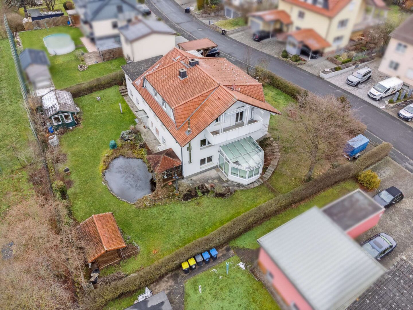 Hinter dem Haus befindet sich ein wundervoller Garten, von dem Ihnen ca. 65 m² zur freien Verfügung. Verbunden ist diesem Abschnitt direkt mit Ihrer Terrasse, die Sie direkt vom Wintergarten aus betreten können. Highlight des Gartens ist ein Teich, der besonders an warmen Tagen die Idylle der Außenanlage unterstreicht. Das Wasser für die Teichanlage wird über das ablaufende Dachwasser in einer Zisterne gesammelt. Zur Unterbringung von Gartengeräten- und zubehör wird eine große Gartenhütte genutzt. Außerdem steht eine Salzberger Blockhaussauna zur allgemeinen Nutzung bereit.