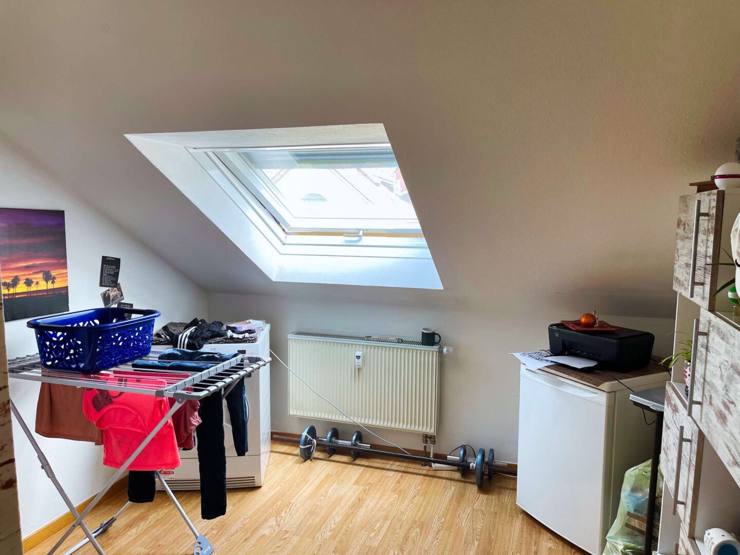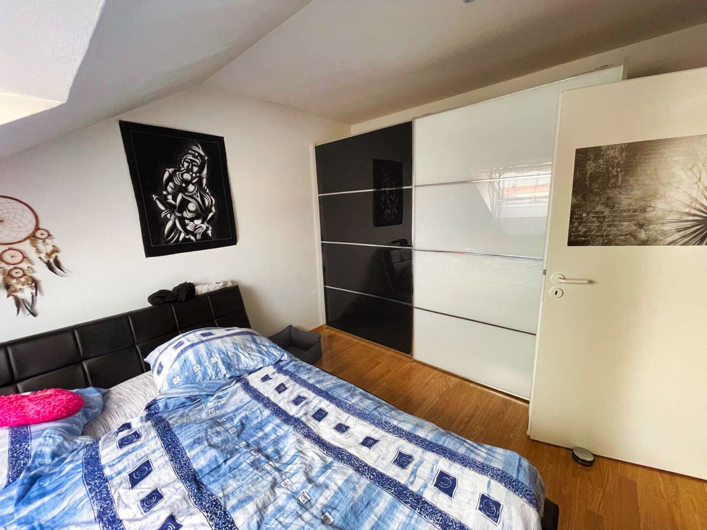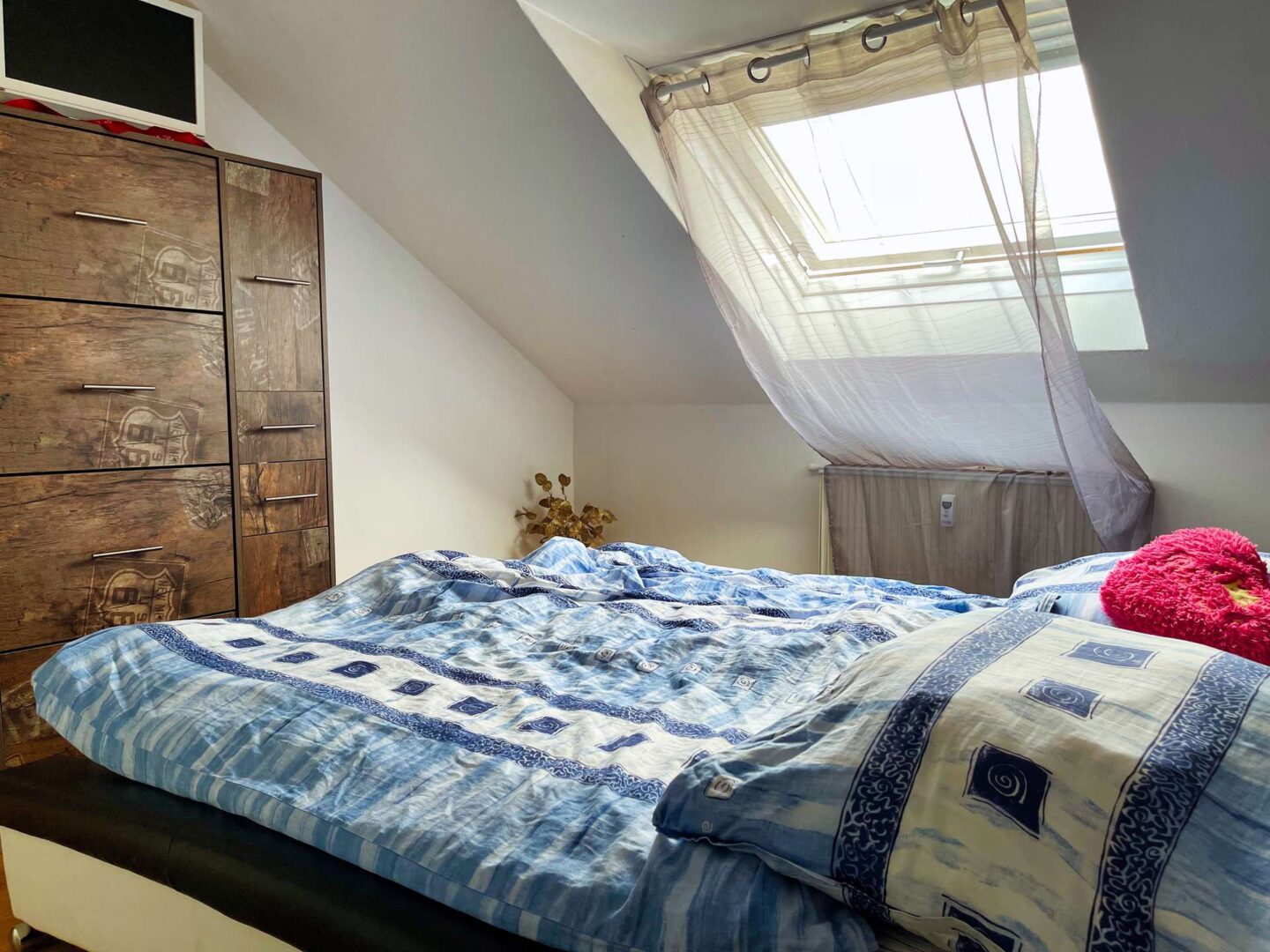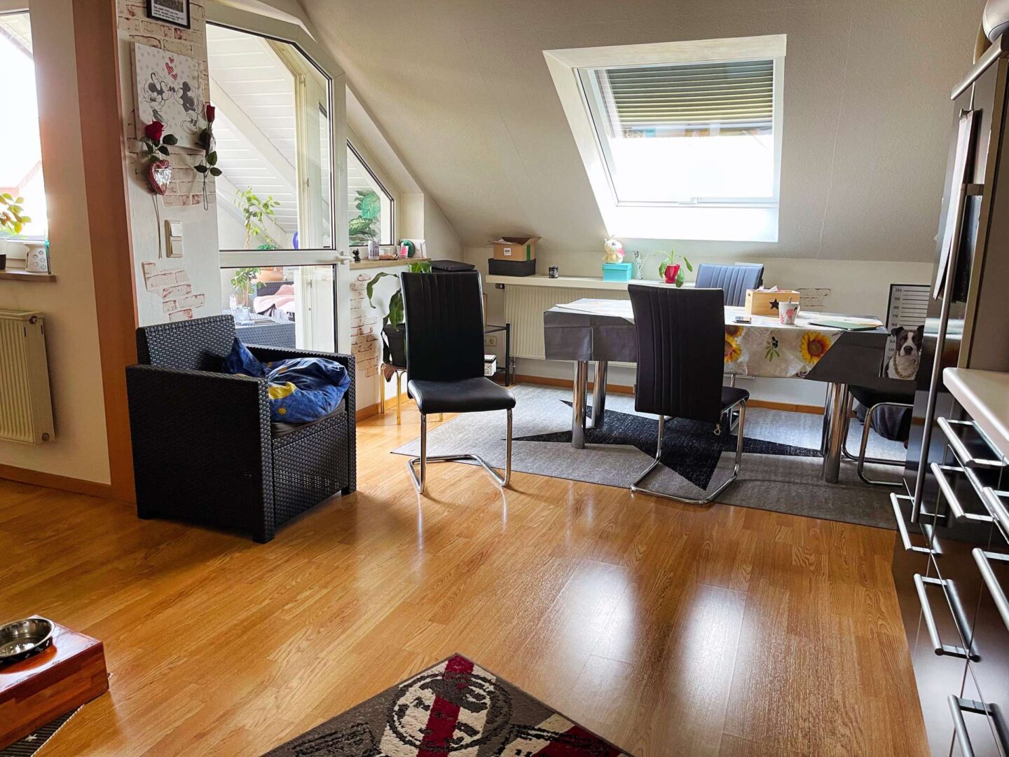 Sie befindet sich im 3. OG eines im Jahre 1991 erbauten Mehrfamilienhauses mit 22 Eigentumswohnungen und verfügt über drei einladende Zimmer inkl. Abstellraum. Modern geschnitten präsentiert sich die Wohnung mit einem großzügigen Wohn-/Küchen- und Essbereich, welcher Zugang zu einem großen und überdachten Balkon bietet. Alle Dachfenster verfügen über einen Rolladen mit elektrischen Antrieb. Zur Wohnung gehört zudem eine Einbauküche, ein Bad mit Badewanne und ein großzügiger Abstellraum.